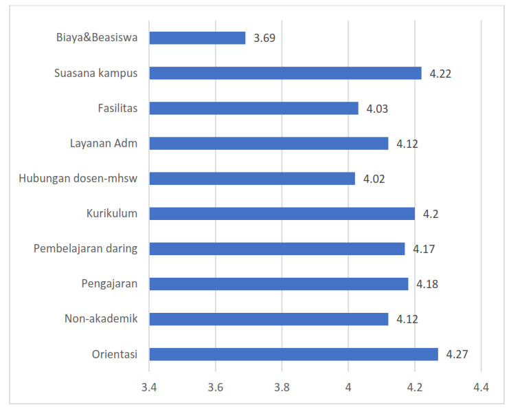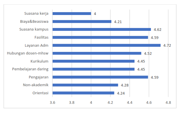 Aspek yang dinilai sudah relatif baik adalah suasana kampus, fasilitas, layanan administrasi, hubungan dosen dengan mahasiswa dan pengajaran. Sementara itu, aspek yang mendapat penilaian rendah adalah suasana kerja.