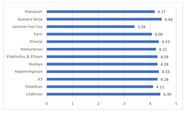 Aspek yang dinilai sudah relatif baik adalah suasana kerja, budaya, kepemimpinan dan K3 (Keselamatan dan Kesehatan Kerja). Sementara itu, aspek yang mendapat penilaian rendah adalah jaminan hari tua dan remunerasi.