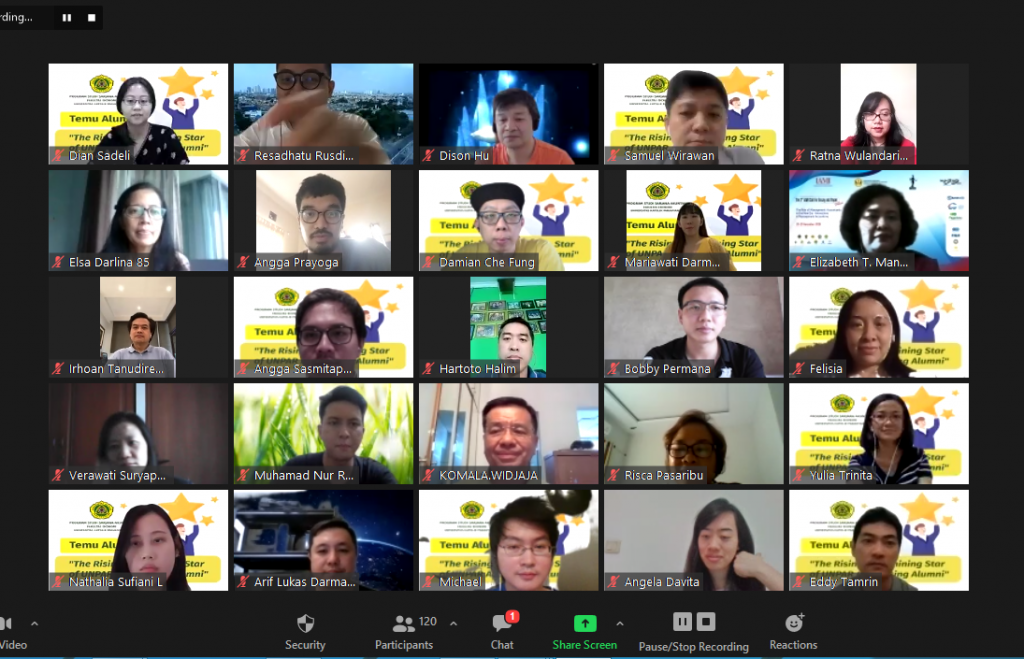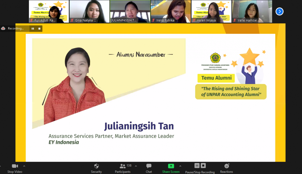 Sabtu, 28 November 2020 Program Studi Akuntansi Unpar telah menyelenggarakan Temu Alumni Akuntansi yang mengangkat tema “The Rising and Shining Star of Unpar Alumni”. Tujuan penyelenggaraan acara temu alumni akuntansi adalah sebagai sarana silaturahmi dan nostalgia, serta diskusi pembentukan Ikatan Alumni Akuntansi. Acara ini dimulai pada pukul 14.00 s/d 16.00 WIB dengan menggunakan aplikasi zoom meeting. Acara temu Alumni diawali dengan doa pembukaan oleh Ibu Dra. Elsje Kosasih, Ak., M.Sc dan kata sambutan oleh Bapak Drs.Arthur Purboyo, Ak., M.Pac, dilanjutkan dengan sharing session dari alumni yang menceritakan tentang kilas balik, success story, manfaat yan dirasakan dari kuliah di Program Studi Akuntansi Unpar, kesan dan pesan. Para alumni yang mengisi sesi sharing session, antara lain: Ibu Julianingsih Tan (Assurance Services Partner, Market Assurance Leader EY Indonesia)- Alumni Akuntansi Angkatan 1984, Bapak Puji Harsono (Owner Gita Sarana Consulting ) – Alumni Akuntansi Angkatan 1978, Bapak Tommy Hartanto (Associate Director – Regulatory and Compliance PT. Deloitte Konsultan Indonesia) – Alumni Akuntansi Angkatan 2002, Wimam Limandibrata (RTM Strategy & Business Development Director Danone Aqua ) – Alumni Akuntansi Angkatan 2003, Johan Yosuardi Sunaryo (Commercial Organization Development Executive HM Sampoerna, Tbk.) – Alumni Akuntansi Angkatan 2013, dimoderatori oleh Ibu Gina Natalia Astari, SE – Alumni Akuntansi Angkatan 2010 dan Helen Wijaya.