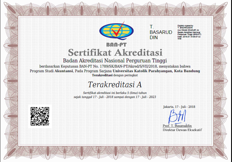 Sesuai KEPUTUSAN BADAN AKREDITASI NASIONAL PERGURUAN TINGGI NOMOR : 1789/SK/BAN-PT/Akred/S/VII/2018 tertanggal 17 Juli 2018, PRODI SARJANA AKUNTANSI FE UNPAR kembali mendapat Peringkat TERAKREDITASI A.