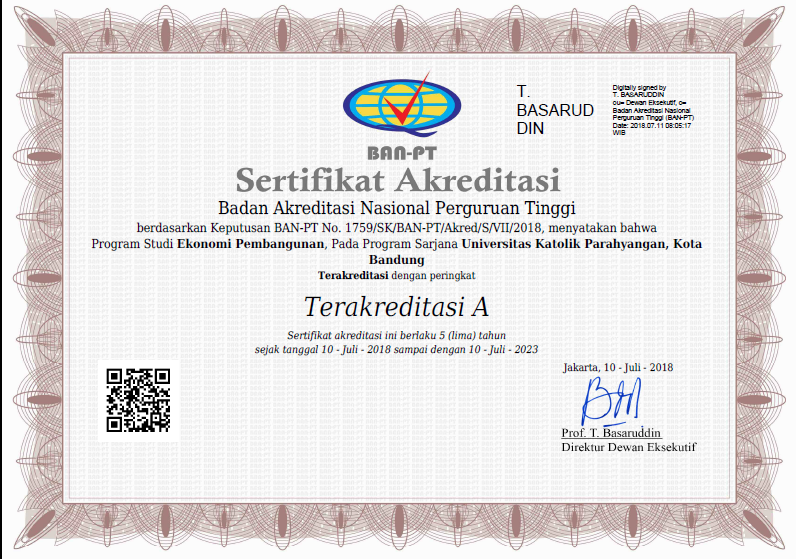 Sesuai KEPUTUSAN BADAN AKREDITASI NASIONAL PERGURUAN TINGGI NOMOR : 1759/SK/BAN-PT/Akred/S/VII/2018 tertanggal 10 Juli 2018, PRODI SARJANA EKONOMI PEMBANGUNAN FE UNPAR kembali mendapat Peringkat TERAKREDITASI A.